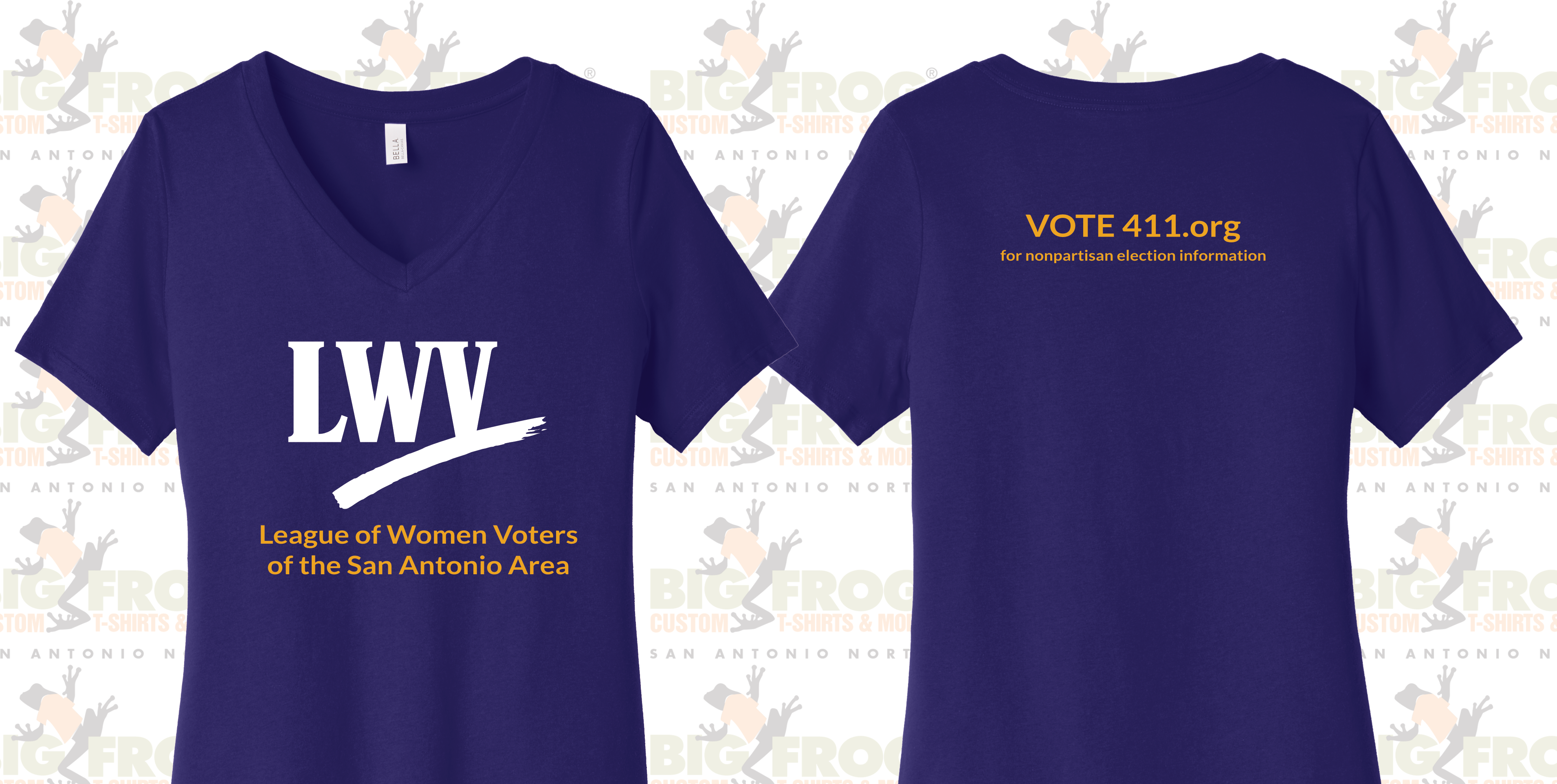 Big Frog Custom T-shirts set up an on-line store so that our volunteers can order the t-shirt of their choice. In addition to the traditional t-shirt design on a navy shirt it is also available as a purple shirt with a white LWV logo and gold letters. Both designs stay true to the LWV branded logos and colors. It can be ordered as a short sleeve with either a V-neck or crew neck. The crew neck also has a long sleeve option. All of the shirts are made with preshrunk cotton and much softer than the current shirts.